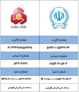 ۲- همچنین می توانید وجه ثبت نام را به شماره کارت های زیر واریز نموده و سپس با شماره ۰۹۱۹۶۸۳۵۵۶۵ (آقای مهندس قربانی) تماس حاصل فرمایید.
